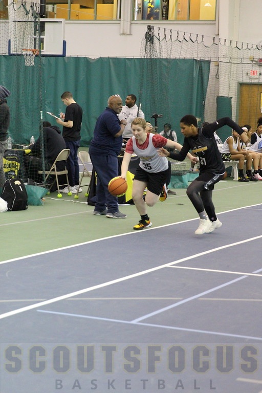 Heaven Grumm, of Philadelphia (PA) New Foundation Charter HS, is a 5'6 145lb 2022 prospect from our Spring 2020 NY camp. College coaches on camp staff identified Heaven as having college potential. Heaven has a great wingspan that gives the player the potential to be a lock down defender and can be even more effective with active hands/feet. Additionally, the prospect appears to have solid size for position and should use their size to be a pesky defender. The talented passer, distributes the ball well seeing the floor and anticipating when and where teammates will be open creating easy buckets. In terms of ball handling, the prospect showed decent handle and has the potential to be a primary ball handler with daily work. The prospect's Basketball IQ definitely stood out at camp and proved to be really good. Through continued emphasis on making the right play through watching/learning the game, it can be a big advantage in recruiting. A big part of IQ is shot selection. Heaven does a great job of understanding when there is enough time and space to shoot the ball and will continue to develop this knowledge by watching how this is done at various college levels. Making the extra pass and taking only open in-rhythm shots proved to be a reliable asset for the prospect. The prospect displayed sound shooting mechanics that will continue to develop with form shooting and made game speed repetitions We recommend making at least 750 game speed shots a day off the screen(curl/fades), off the bounce, spot shooting, etc. The talent impressed finishing around the rim through contact and in traffic. With continued work finishing through traffic with either hand, adding even more finishing moves, the player will continue to be a grave threat around the basket. The talented player has good athletic ability for size and age. ScoutsFocus would like to see continued development in speed/agility and vertical development. Jump rope drills are great full body conditioning drill we highly recommend if not ready for a rigorous weight-training program. The prospect showed a solid level of strength. We would like to see continued strength development whether it is via traditional strength training means or body weight military type development(pushups/pull-ups). Combined with the player's solid frame that should to continue to build year around, the player will be physically ready to play at the next level. The talent has a decent motor (highly coveted skill by college coaches) and we would like to see them continue to make every possession an major priority and from what we saw, the player showed physical and mental toughness throughout camp. The player showed a great understanding and effort on the defensive side of the ball and should continue to focus on individual and team defensive concepts emphasized at camp. Heaven has college potential with continued hard work and development both in the classroom and on the hardwood. Can play the 1; 2; 3. AAU Team: Tram Evolution.