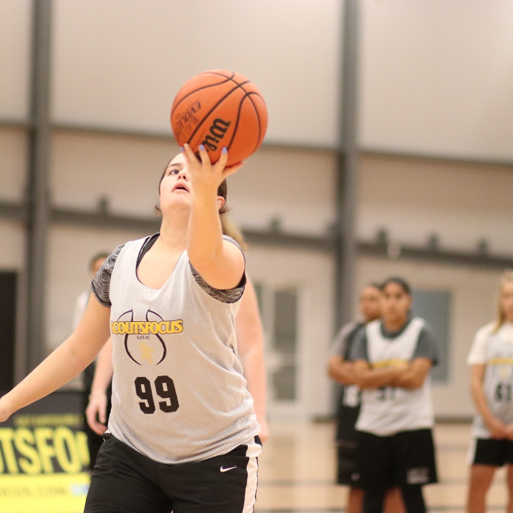 Sarah Jones, of Katy (TX) Morton Ranch, is a 5'8 170lb 2019 prospect from our Fall 2018 DAL camp. College coaches on camp staff identified Sarah as having scholarship potential. Sarah has a great wingspan that gives the player the potential to be a lock down defender and can be even more effective with active hands/feet. Additionally, the prospect appears to have very good size for position when used properly remains advantageous on both sides of the ball. The talented passer, distributes the ball well seeing the floor and anticipating when and where teammates will be open creating easy buckets. In terms of ball handling, the prospect showed a great handle and is on the way to being a primary ball handler. The prospect's Basketball IQ definitely stood out at camp and proved to be really good. Through continued emphasis on making the right play through watching/learning the game, it can be a big advantage in recruiting. A big part of IQ is shot selection. Sarah does a great job of understanding when there is enough time and space to shoot the ball and will continue to develop this knowledge by watching how this is done at various college levels. Making the extra pass and taking only open in-rhythm shots proved to be a reliable asset for the prospect. The prospect was able to consistently knock down shots during camp showing to be a reliable asset. Shooting will continue to develop with form shooting and made game speed repetitions. We recommend making at least 500 game speed shots a day off the screen(curl/fades), off the bounce, spot shooting, etc. The talent impressed finishing around the rim through contact and in traffic. With continued work finishing through traffic with either hand, adding even more finishing moves, the player will continue to be a grave threat around the basket. The talented player has very good athletic ability for size and age. ScoutsFocus would like to see continued development in speed/agility and vertical development. Jump rope drills are great full body conditioning drill we highly recommend if not ready for a rigorous weight-training program. The prospect is very strong for their age. The college game is an entirely different beast so continued strength development is crucial to prepare going against 23-24 year-olds. Combined with the player's solid frame that should to continue to build year around, the player will be physically ready to play at the next level. The talent showed a very good motor (highly coveted skill by college coaches) that remained mostly active on possessions and from what we saw, the player showed physical and mental toughness throughout camp. The player showed a great understanding and effort on the defensive side of the ball and should continue to focus on individual and team defensive concepts emphasized at camp. Sarah has scholarship potential with continued hard work and development both in the classroom and on the hardwood. Can play the 4. AAU Team: Shooting Stars.